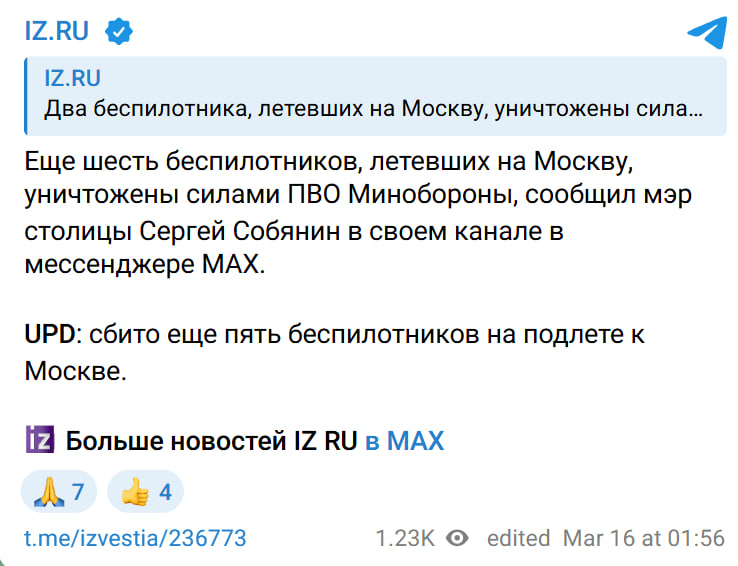 Российские медиа, в частности СМИ "Известия", около 02:00 часов в ночь на 16 марта писали, что возле Москвы было якобы сбито сначала шесть, а затем еще пять дронов, летевших в направлении столицы РФ. Примерно через полчаса росСМИ со ссылкой на мэра Москвы Собянина сообщали о якобы сбитии еще пяти дронов на окраинах города.