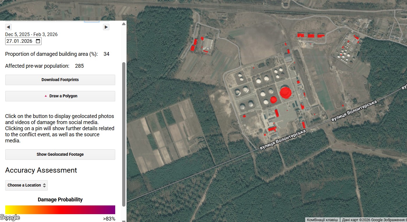 Заметим, что статья, на которую ссылаются на аналитическом портале, появилась еще в декабре 2025 года. Благодаря специальной обработке миллионов спутниковых фото земной поверхности алгоритм научился различать степень разрушения. Результаты по пиксельному анализу выложены в свободный доступ для всех желающих. Одна из возможностей — выбрать дату и обвести нужную область. После этого появляется результат работы алгоритма: для станции "Броды" показывает группу красных пятен на территории объекта нефтяной инфраструктуры.