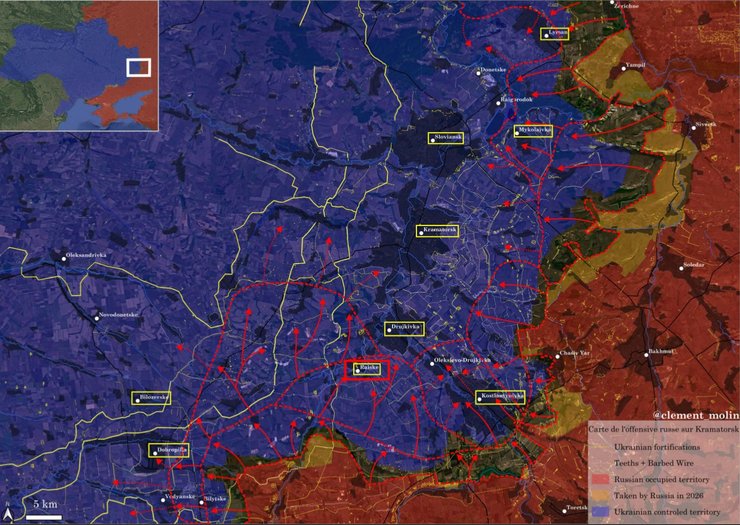 16 марта. Славянское направление. Французский OSINTер Clément Molin отреагировал на прорыв ВС РФ в районе Северска. По его оценкам, на которые обратили внимание в канале In Factum, основной удар РФ направлен на Славянск, а для этого россиянам следует продвинуться по всей линии от Лимана через Константиновку до Доброполья. Аналитики при этом пояснил, что позади этого города Украина возвела три непроницаемые линии обороны, а "основное наступление развернется в районе Райского" (между Добропольем и Дружковкой). На указанном отрезке собрали 18 бригад и 8 восемь дивизий (ориентировочно, 126-250 тыс.), а, для сравнения, под Запорожьем — несколько меньшие силы (15 бригад и 6 дивизий).
