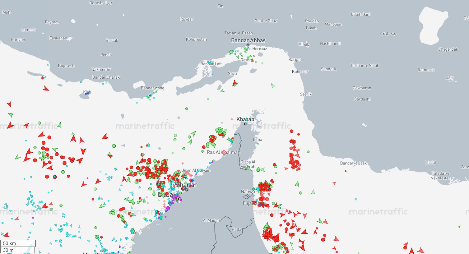 На мониторинговом портале Marinetraffic показана ситуация в Ормузском проливе по состоянию на 27 марта. Видим, что пролив, шириной 80 км, пустой, а вокруг — скопление десятков кораблей, находящихся в Персидском заливе (западнее) или в Оманском заливе (восточнее).