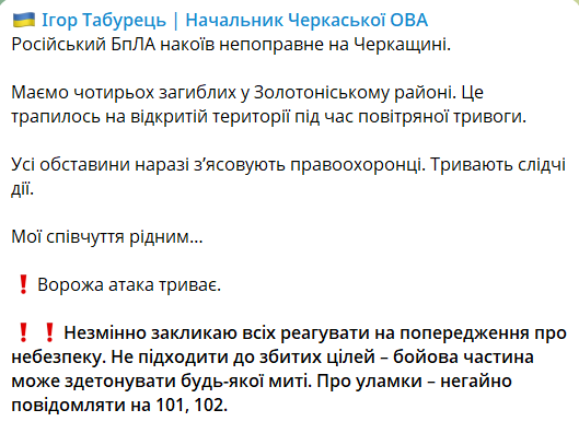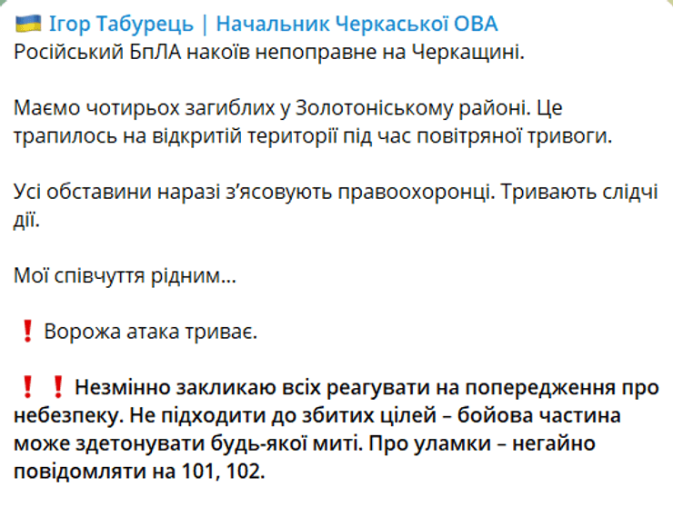 О трагедии сообщил в соцсетях глава Черкасской областной военной администрации Игорь Табурец.
