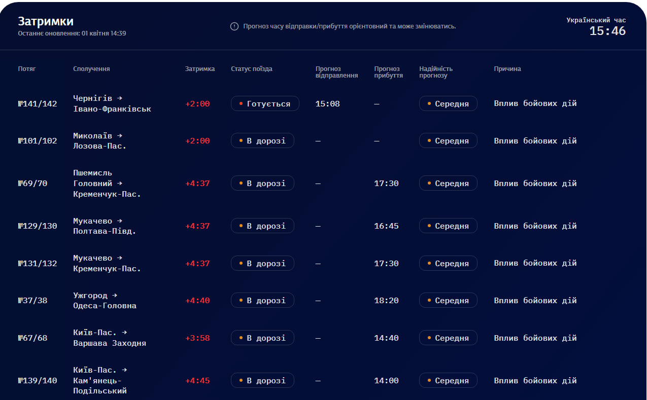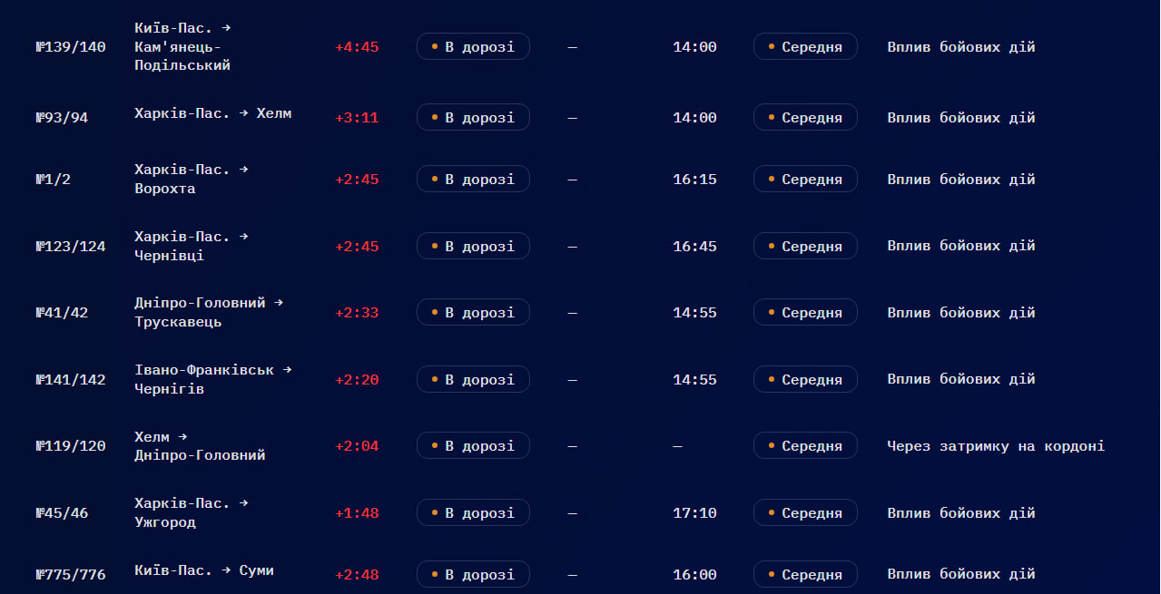 На момент написания новости известно о 16 поездах, движение которых задержано из-за угрозы ударных беспилотников. Задержка составляет от почти двух до более пяти часов. Указанная причина — "влияние боевых действий". Преимущественно это поезда, следующие на запад Украины.