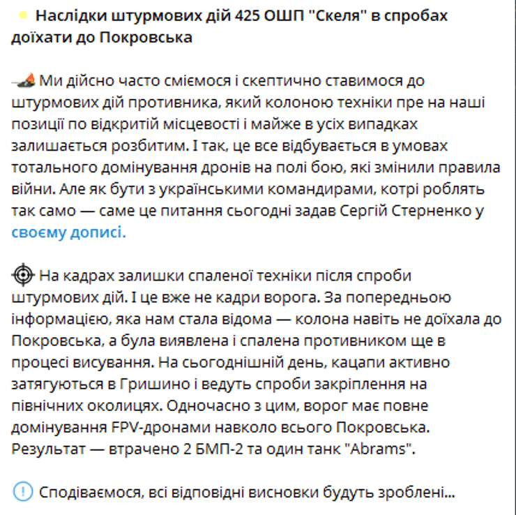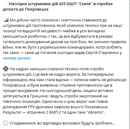 Напомним, что по поводу штурма под Покровском возникла публичная дискуссия. Советник министра обороны Сергей Стерненко заявил о значительных потерях из-за действий командования 425-го полка "Скала". В полку эти обвинения отвергли и озвучили официальные данные об обстоятельствах штурма.