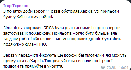 "Большинство из вражеских БПЛА были реактивными и враг впервые применил их по Харькову. Прилетов могло быть больше, но благодаря работе военных часть вражеских дронов была сбита - спасибо силам ПВО", - отметил Терехов.
