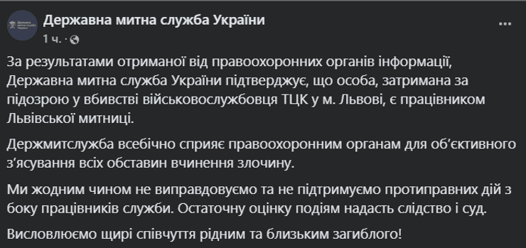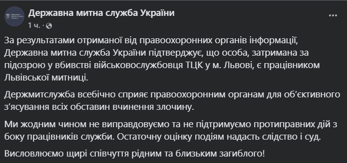 "По результатам полученной от правоохранительных органов информации, Государственная таможенная служба Украины подтверждает, что лицо, задержанное по подозрению в убийстве военнослужащего ТЦК в г. Львове, является работником Львовской таможни. Гостаможслужба всесторонне способствует правоохранительным органам для объективного выяснения всех обстоятельств совершения преступления. Мы никоим образом не оправдываем и не поддерживаем противоправных действий со стороны сотрудников службы. Окончательную оценку событиям даст следствие и суд", — отметили в Государственной таможенной службе Украины.