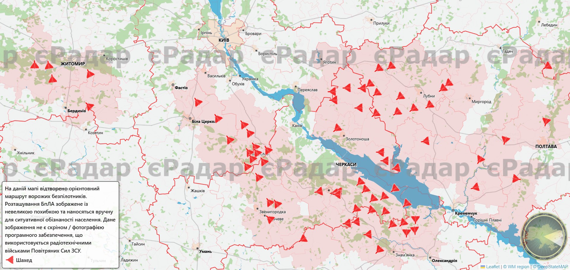 Воздушное командование в 11:04 проинформировало, что ракеты ВС РФ свернули из Черкасской области на Киев. Также добавили, что в том же направлении движутся российские БПЛА. Кроме того, часть ракет (вероятно, около трех) продолжили движение в сторону Винницкой области.