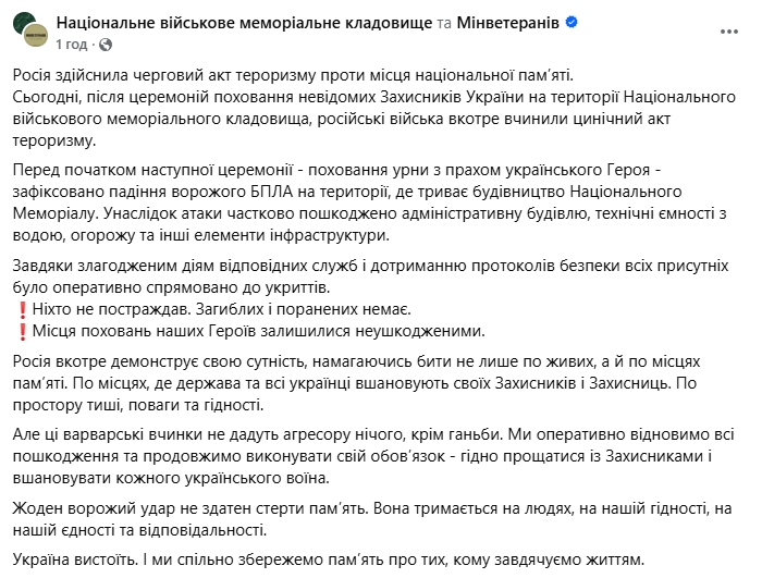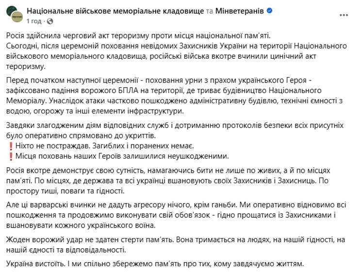"Россия совершила очередной акт терроризма против места национальной памяти. Сегодня, после церемоний захоронения неизвестных Защитников Украины на территории Национального военного мемориального кладбища, российские войска в очередной раз совершили циничный акт терроризма", — сообщили в пресс-службе Национального военного кладбища.