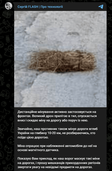 "Показываю Вам пример, как наш враг маскирует такие мины на дорогах, и прошу жителей приграничных регионов обращать внимание на неизвестные предметы на дорогах", — резюмирует Флеш.