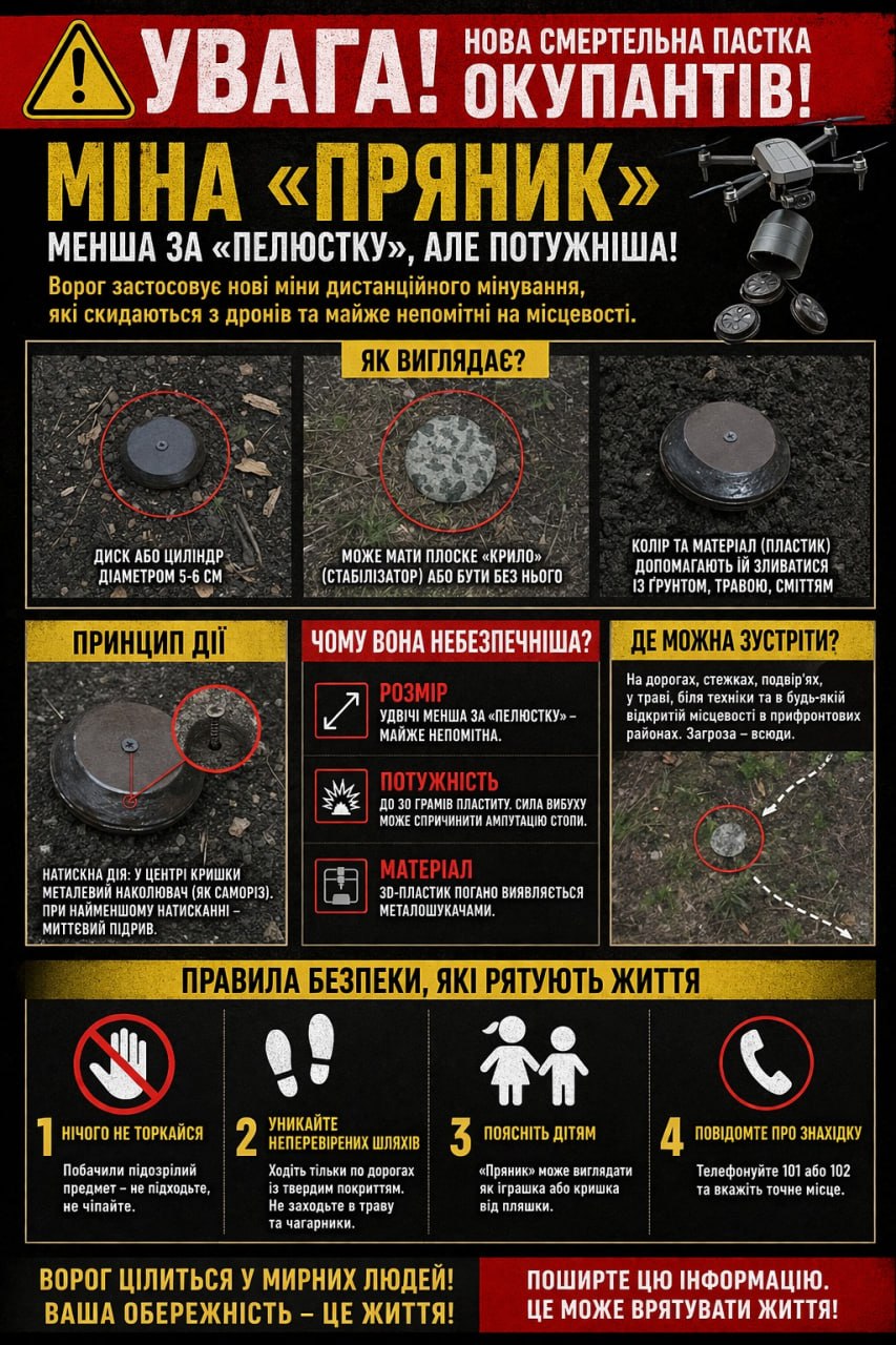 В Никопольской РГА предупредили об угрозе применения россиянами противопехотных мин дистанционного минирования "Пряник". Там объяснили, что необходимо знать этот тип боеприпаса: