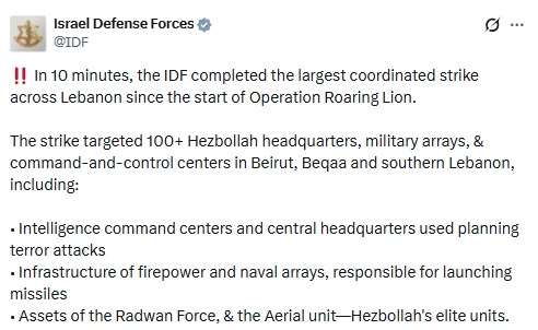 За 10 минут Армия обороны Израиля завершила крупнейший скоординированный удар по Ливану с начала операции "Рычащий лев" (Roaring Lion), сообщили военные.