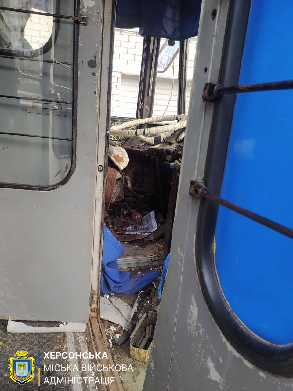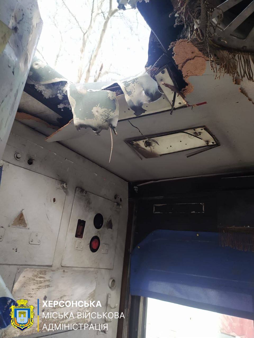Начальник Херсонской городской военной администрации Ярослав Шанько опубликовал фотографии, сделанные изнутри поврежденного троллейбуса.