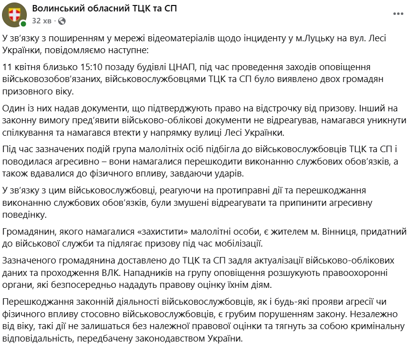 Во время указанных событий к военнослужащим ТЦК и СП подбежала группа малолетних лиц, которые в агрессивной форме пытались помешать выполнению служебных обязанностей, нанося удары. Из-за этого военнослужащие, как говорится в сообщении, были вынуждены прекратить агрессивное поведение.