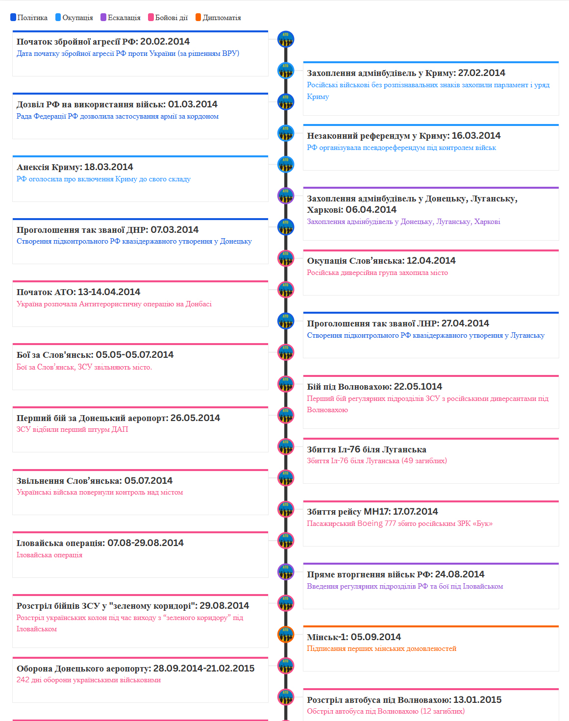 2015 год — в январе завершилась оборона Донецкого аэропорта, а боевики обстреляли автобус с гражданскими людьми под Волновахой. Тогда же состоялся обстрел жилого дома на окраине Мариуполя. С января по февраль — бои под Дебальцево, которые завершились подписанием Минских соглашений-2.