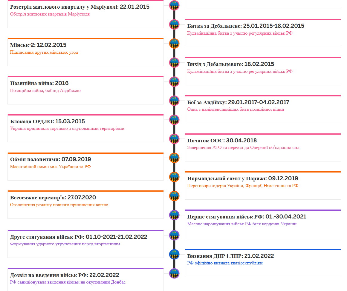 События на Донбассе развернулись после Революции Достоинства, когда тогдашний президент Украины Виктор Янукович и его сообщники сбежали в РФ, прихватив с собой средства из государственной казны. Фокус составил тайм-лайн периода 2014-2022 годов, чтобы показать хронологию АТО: бои и политические решения, их последствия и потери в течение 12 лет войны РФ против украинцев.