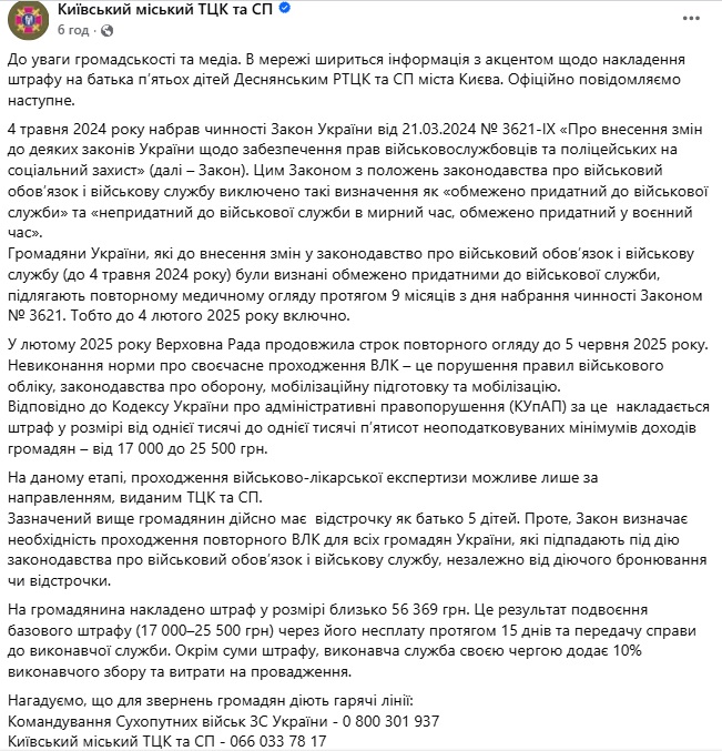 "Указанный выше гражданин действительно имеет отсрочку в качестве отца 5 детей. Однако Закон определяет необходимость прохождения повторного ВЛК для всех граждан Украины, подпадающих под действие законодательства о воинской обязанности и военной службе, независимо от действующего бронирования или отсрочки", — объяснили военнослужащие ТЦК.