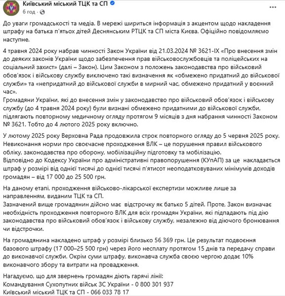 В Украине вызвала резонанс история о том, что отца пятерых детей оштрафовали в Деснянском районном территориальном центре комплектования и социальной поддержки на сумму около 56 369 гривен.