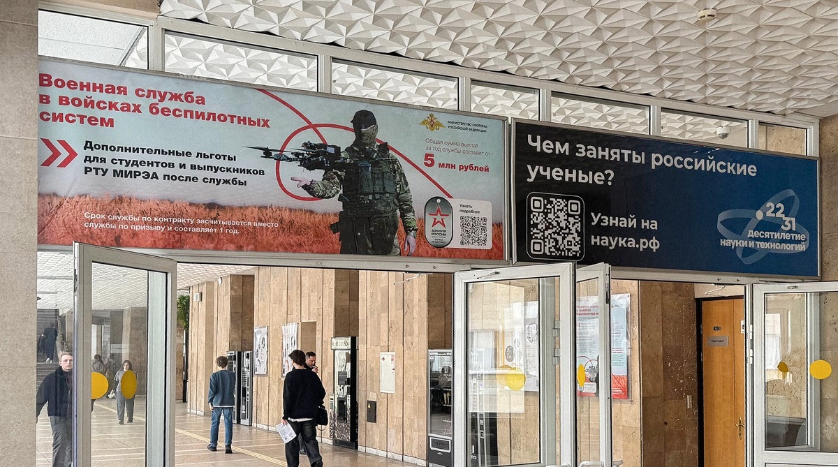 В феврале в Московской высшей школе экономики, занимающей второе место в списке лучших российских университетов по версии Forbes за 2025 год, прошел "Фестиваль беспилотных систем", на котором были широко представлены вербовочные плакаты для формирования беспилотных вооруженных сил РФ.