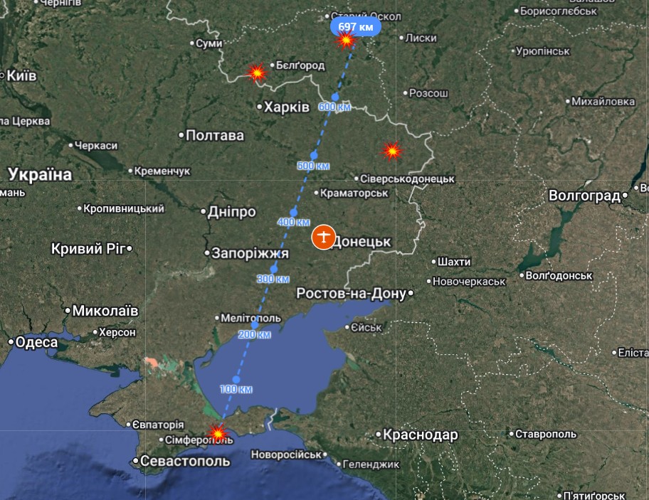 Указанные объекты можно разместить на Google Maps и увидеть, что зона контроля воздушного пространства покрыла Крым, Запорожскую, Донецкую и Луганскую области и достала почти до Белгорода.
