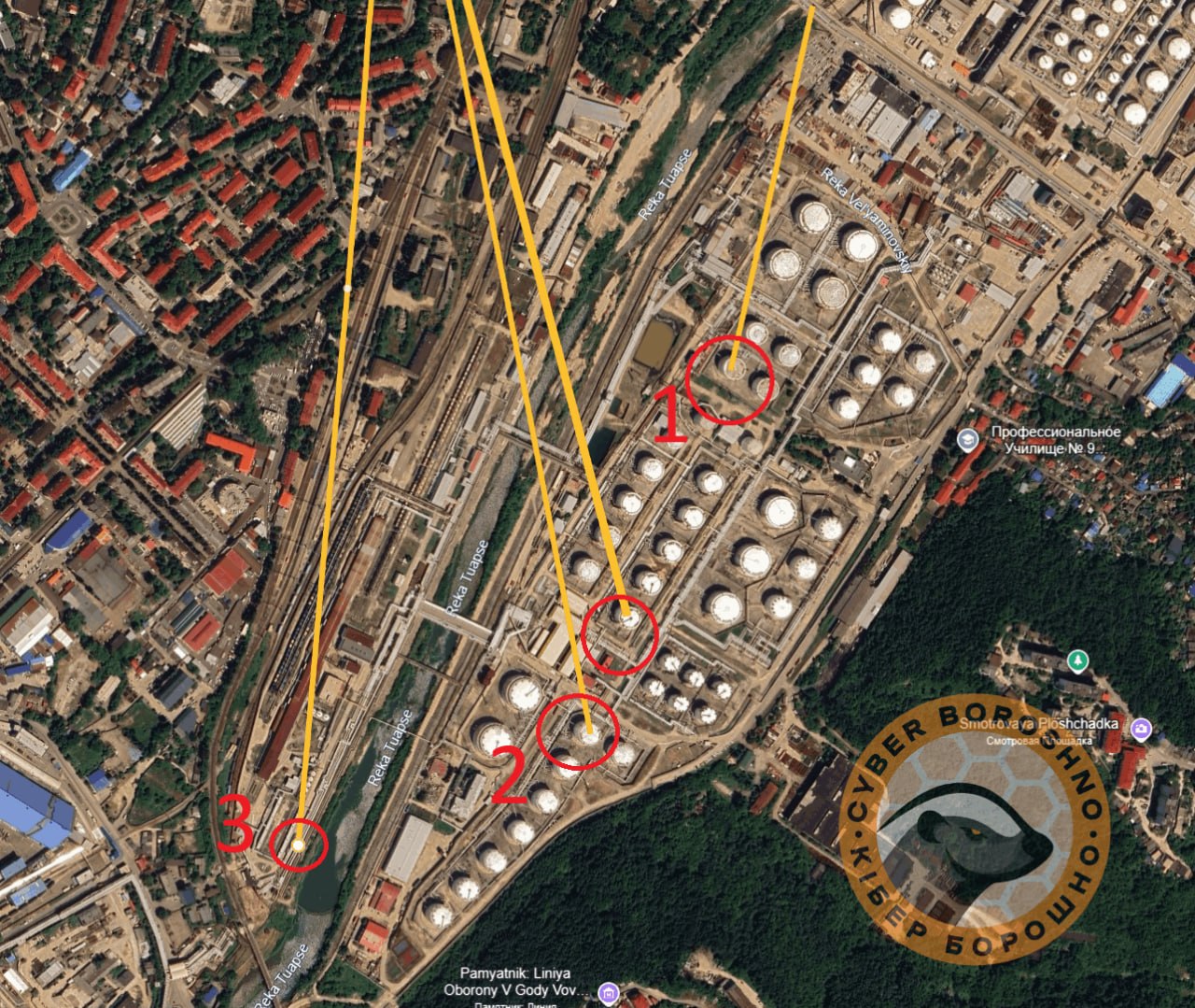 В Telegram-канале OSINTеров "КиберБорошно" провели геолокацию кадров из Туапсе и установили точки поражения. В целом выделили три зоны. Первая зона — площадка с наибольшим пожаром, над которой поднялось наибольшее облако продуктов горения: координаты 44.098144, 39.090519. Вторая — попадание в резервуары, при этом сначала горело не сильно, но впоследствии огонь перекинулся на соседние объекты и стало действительно "горячо": координаты 44.094217, 39.088245. Третья — оборудованием, которым нефть шла в морской порт Туапсе: координаты 44.092575, 39.083020. Аналитики также уточнили, что из этого порта Россия экспортировала 25% нефти.