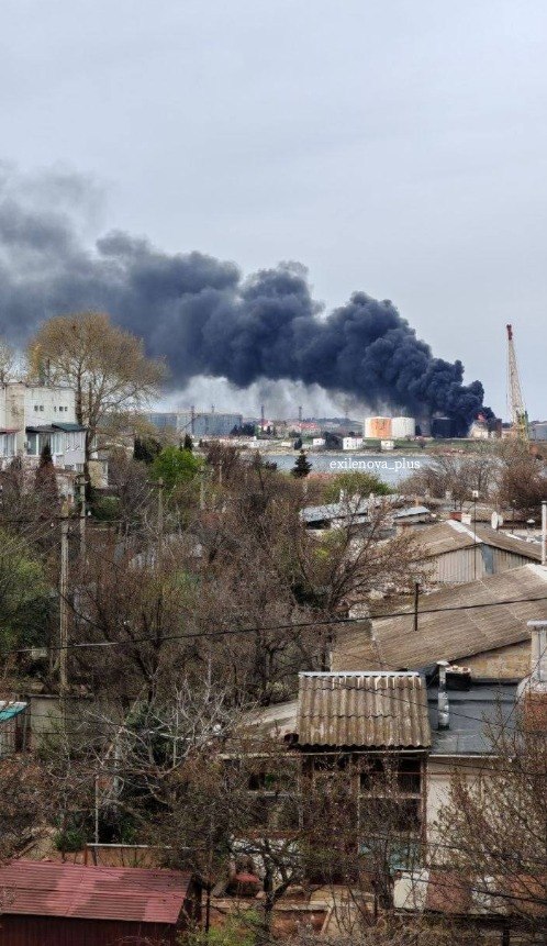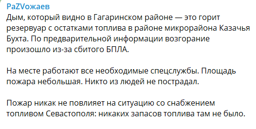 При этом "губернатор" Севастополя Михаил Развожаев заявил, что дым в районе Казачьей Бухты возник из-за сбитого БПЛА, который якобы упал на резервуар с остатками топлива, и пожар, по его словам, совершенно не повлияет на ситуацию со снабжением топливом.