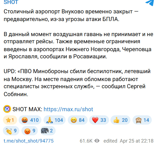 Около 23:00 часов мэр Москвы Сергей Собянин сообщил, что российская противовоздушная оборона якобы уничтожила беспилотник, направлявшийся на столицу РФ. По его словам, зафиксировано падение обломков дрона, на место отправились оперативные службы.