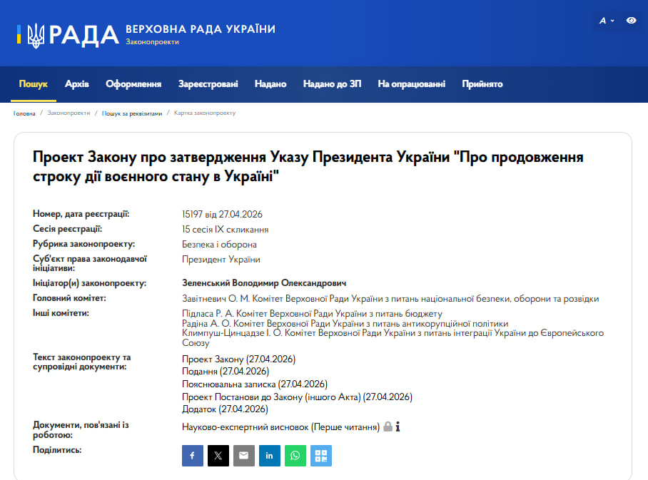 Речь идет о продлении еще на 90 дней, и это решение станет уже 19-м голосованием парламента о продлении военного положения с начала полномасштабного вторжения. Текущий срок действия соответствующих указов истекает 4 мая 2026 года, а в случае принятия новых решений они будут действовать до 2 августа 2026 года.