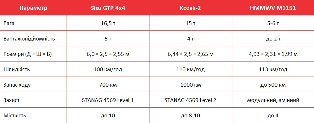 Видим, что финский бронеавтомобиль "выигрывает" в грузоподъемности, поскольку перевозит больше, чем указанные аналоги — 5 т против 4 т у Kozak-2 и 2 т у HMMWV M1151. При этом он несколько медленнее и имеет меньший запас хода. Вместимость отсека для десантирования — такая же, как у украинского изделия, но уровень защиты несколько ниже, показывает таблица.