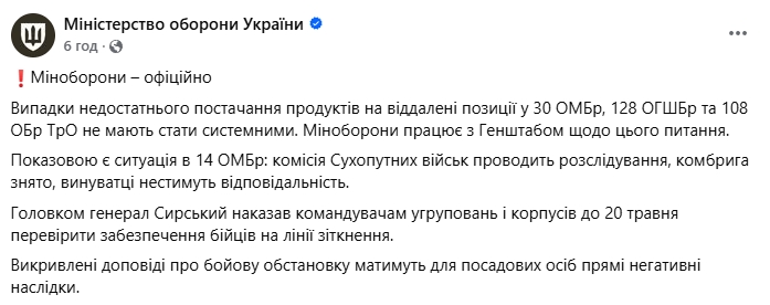 В нем говорилось о том, что "случаи недостаточной поставки продуктов на отдаленные позиции в 30 ОМБр, 128 ОГШБр и 108 ОБр ТрО не должны стать системными. Минобороны работает с Генштабом по этому вопросу".