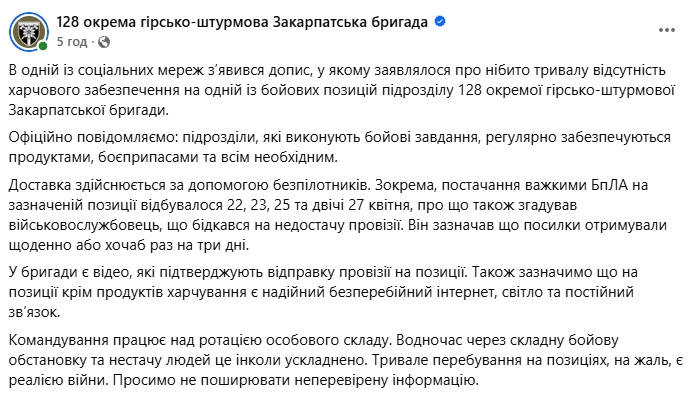 "В одной из социальных сетей появилось сообщение, в котором заявлялось о якобы длительном отсутствии пищевого обеспечения на одной из боевых позиций подразделения 128 отдельной горно-штурмовой Закарпатской бригады. Официально сообщаем: подразделения, выполняющие боевые задачи, регулярно обеспечиваются продуктами, боеприпасами и всем необходимым", — говорится в сообщении 128 ОГШБр.