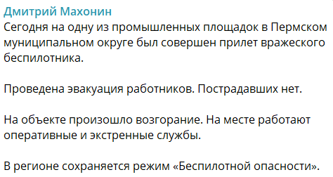 "Сегодня на одну из промышленных площадок в Пермском муниципальном округе был совершен прилет вражеского беспилотника. Проведена эвакуация работников. Пострадавших нет. На объекте произошло возгорание. На месте работают оперативные и экстренные службы. В регионе сохраняется режим "Беспилотной опасности"", — написал он. Сотрудников завода эвакуируют.