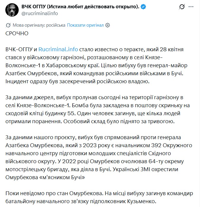 Сообщение о покушении на Омурбекова появилось в сети вечером 28 апреля. Утверждается, что именно в тот день взорвался почтовый ящик в доме, в котором жил генерал, известный как "палач из Бучи". Кроме погибшего Кузьменко, который был командиром батальона учебной связи, получили травмы еще несколько военных, оказавшиеся рядом в момент детонации: количество не указывается.