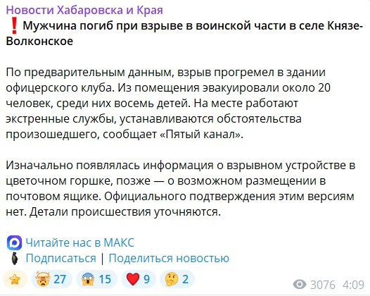 В пабликах Хабаровска действительно есть информация о взрыве в воинской части в селе Князе-Волконском. При этом медиа утверждают, что инцидент якобы произошел в здании местного клуба, а с места событий эвакуировали 20 человек. Также озвучены две версии о тайнике для взрывчатки: это мог быть цветочный горшок или почтовый ящик. РосСМИ подтвердили, что погиб человек, но официально власти не подтвердили взрыв.