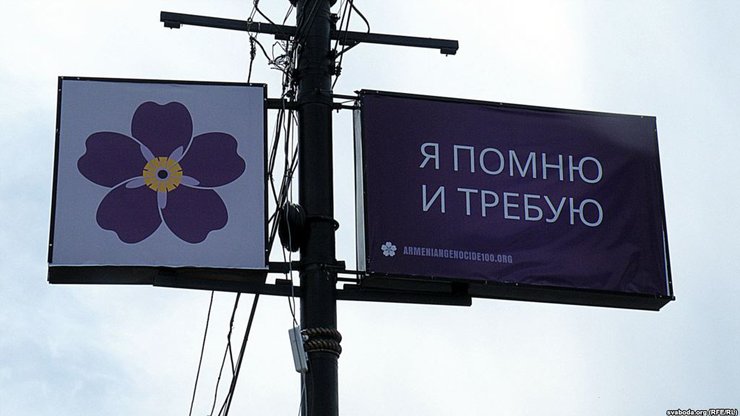 "Георгиевские" ленты еще можно увидеть на Южном Кавказе, в частности в Грузии, но не повсеместно. А в Армении главным символом памяти стали незабудки, и отсылает этот образ к трагическим событиям 100-летней давности — уничтожению 1 млн армян властями Османской империи.