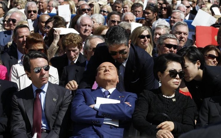 Сильвио Берлускони. Его замечали спящим на заседании правительства, на праздновании 20-летия падения Берлинской стены и даже на беатификации Папы Римского Иоанна Павла Второго. В данном случае, премьер-министр Италии спит во время парада в Риме.