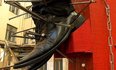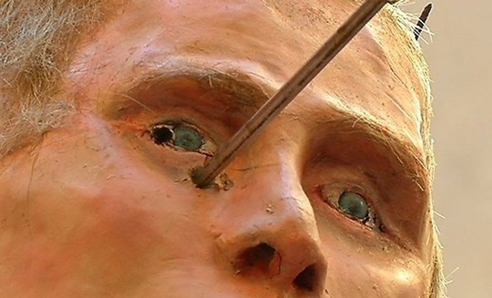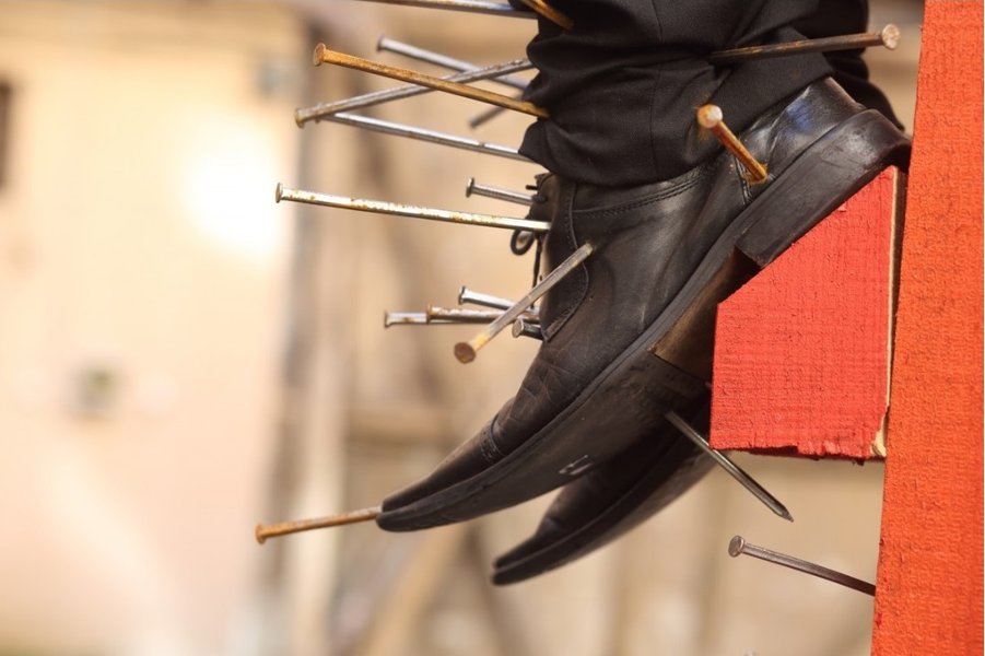Распятый Путин – один из экспонатов выставки. Его автор пожелал остаться неизвестным. Посетители разделились на две группы: те, кто гвозди вбивают, и те, кто их вытаскивают. Посмотреть инсталляции в бывшем здании КГБ можно до конца мая.