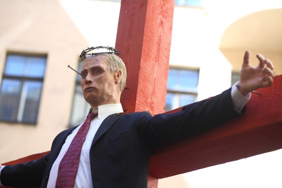 Во дворе бывшего здания КГБ появилась статуя распятого на кресте президента России Владимира Путина. Вбить в него гвоздь могут все желающие, сообщает Tv5.