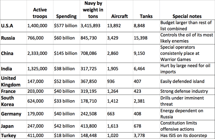Во второй половине десятки лучших армий мира числятся Франция, Южная Корея, Германия, Япония и Турция.