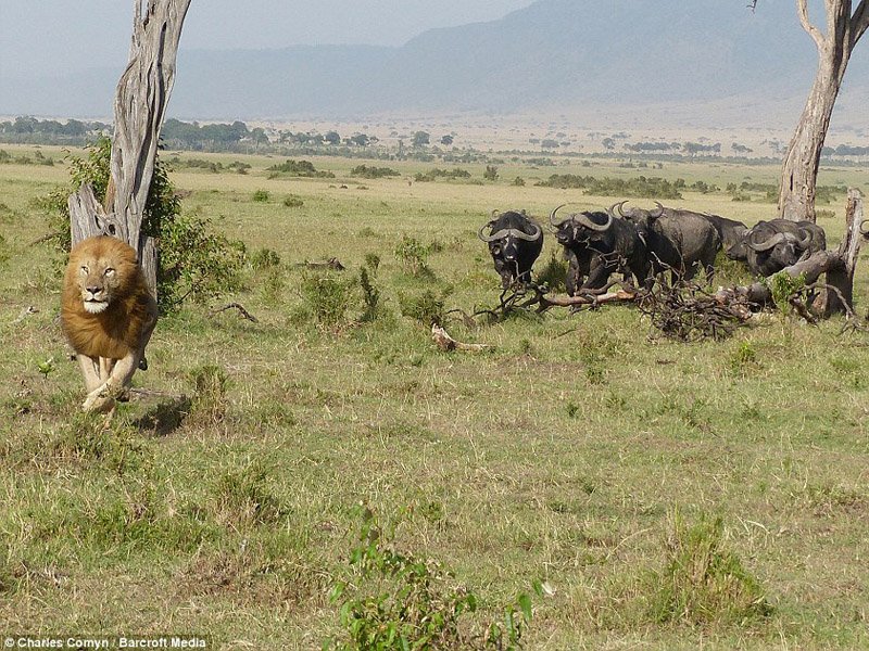 Только после того как льву удалось сбежать, буйволы вернулись на поляну.
