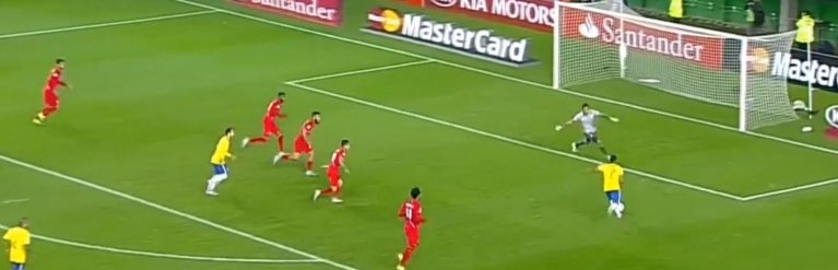 Через полторы минуты правый защитник бразильской сборной Дани Алвес навесил в центр штрафной. Рядом с форвардом "Барселоны" Неймаром никого не оказалось, и он головой переправил мяч в сетку ворот - 1:1.