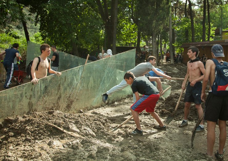 Самое главное и светлое в этой трагедии — добровольцы, молодые жители города. Единый Тбилиси. Поражает фантастическая самоорганизация молодежи, четкие указания через Facebook, где создана специальная страница. На какую улицу идти, что делать, как одеваться (не надевать шорты и короткие брюки, несмотря на жару, так как ужасные санитарные условия, есть опасность инфекций), что нужно нести — по пунктам, в том числе в каждую гостиницу: от зубной пасты, тапочек до лекарств. Добровольцев больше 17 тысяч — студенты, актеры, учителя, врачи, священники. Рядом бок о бок люди разных наций, много украинцев, русские, поляки, казахи, армяне, азербайджанцы, африканцы — студенты местных вузов. На кадрах и фото мелькают дети с вениками и лопатками. Добровольцы часто оказываются на местах раньше спасателей, спецназа, Национальной гвардии, армии, полиции.