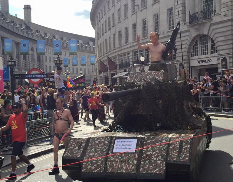 Персонаж президента Российской Федерации Владимира Путина возглавил гей-парад в Лондоне, написал российский журналист Алексей Лушников в Facebook, разместив фото. "Путин" проехал на танке, "стреляя" в зрителей из надувного автомата.
