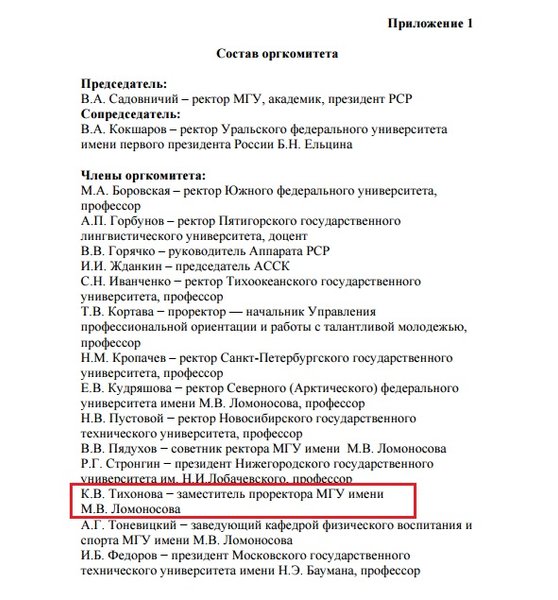 "В свои 28 лет дочь Владимира Путина Катерина Тихонова (Путина) стала не только руководителем Центра национального интеллектуального резерва МГУ им. М. В. Ломоносова, директором Фонда поддержки научно-проектной деятельности студентов, аспирантов и молодых ученых "Национальное интеллектуальное развитие" (учредителем которого является МГУ) и членом руководящего органа университета - ученого совета МГУ, куда входят обычно доктора наук и деканы факультетов МГУ. Как выяснилось совершенно случайно, Тихонова также занимает административную должность заместителя проректора МГУ", - сообщил Навальный.