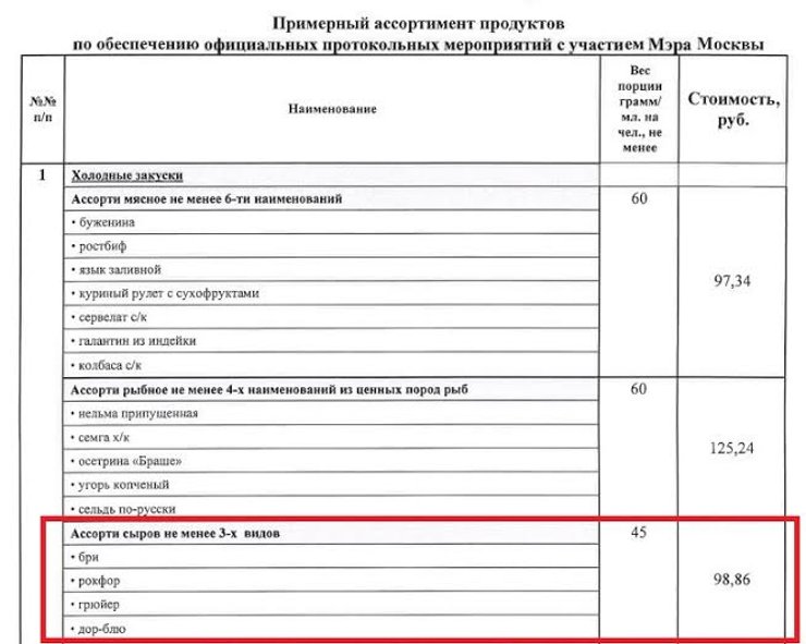 Навальный опубликовал документы свидетельствующие, что мэрия Москвы закупает французские сыры бри, рокфор, грюйер, дор-блю. Минобороны РФ закупило на банкет салат с креветками и сыром пармезан за 300 тыс. руб.