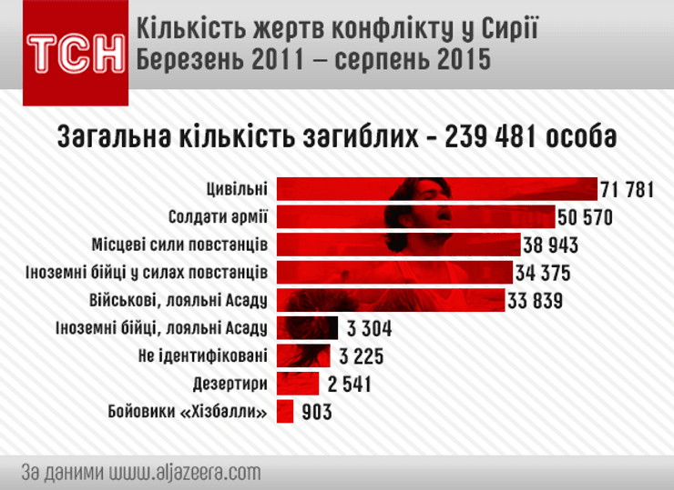 В течение 4 лет боевых действий в Сирии жертвами конфликта в целом стали более 239 тыс. человек, среди которых 72 тысячи мирных жителей, сообщает ТСН. Вооруженный и политический конфликт в Сирии начался 15 марта 2011 года с демонстраций, которые были частью Арабской весны, и перерос в восстание и гражданскую войну в 2012 году.