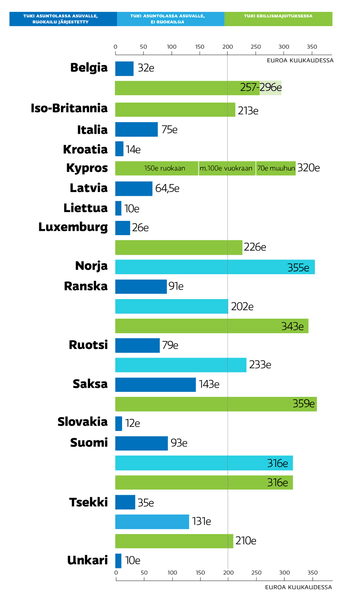 Синий: пособие для проживающих в общежитии с питанием. Голубой: пособие для проживающих в общежитии без питания. Зеленый: пособие для проживающих отдельно. Фото: Yle Uutisgrafiikka