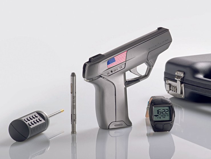 В самом пистолете тоже есть интересное нововведение. Если часов нет рядом или они не активированы, пистолет не только не позволяет нажать на спусковой крючок, но и блокирует обойму. Вынуть ее из пистолета и получить доступ к патронам, к примеру, у детей — не получится.