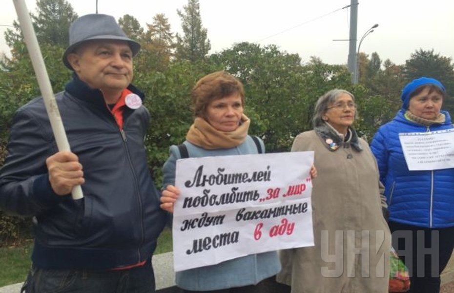 Участникам акции выдают значки с надписью "Нет войне", нанесенной на фоне флагов Украины и РФ.