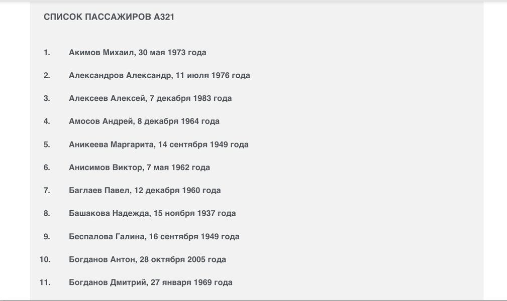 МЧС России опубликовало список пассажиров самолета Airbus А321 авиакомпании "Когалымавиа", выполнявшего рейс Шарм-Эль-Шейх - Санкт-Петербург и разбившегося на севере Синайского полуострова.