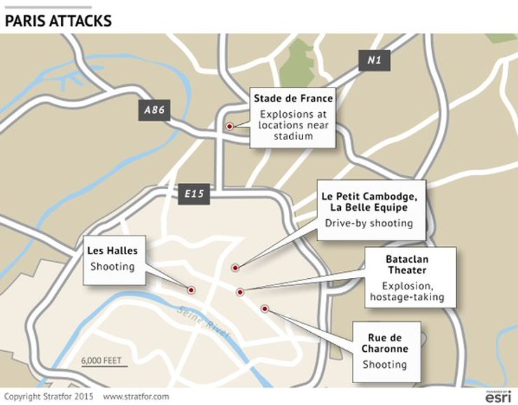 Специалисты американской частной разведывательно-аналитической компании Stratfor составили карту терактов, совершенных в пятницу 13-го в Париже.