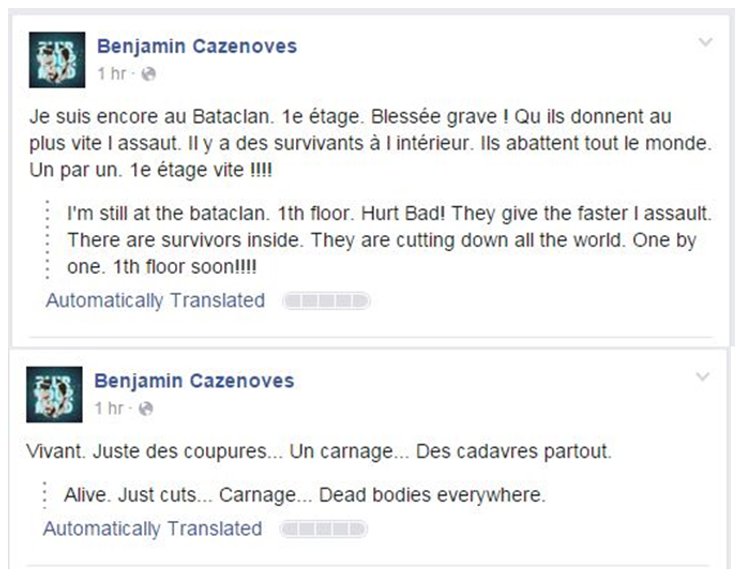 "Я все еще в Батаклане. Первый этаж. Сильно ранен! Быстрее бы нас освободили. Внутри есть выжившие. Они всех добивают. Одного за другим. Скоро будут и на первом этаже!"